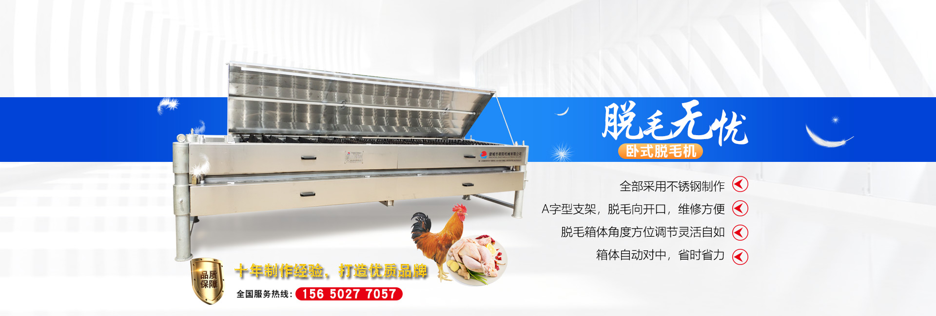 公司主要設(shè)備有:A字型立式脫毛機、臥式脫毛機、強力噴淋機、松毛機、浸燙池、螺旋預(yù)冷機、禽籠清洗機、電暈機、兔割前爪/后爪機、剝胗機、自動洗鉤機、螺旋燙爪機、雞爪脫皮機、分割輸送帶等屠宰用設(shè)備。